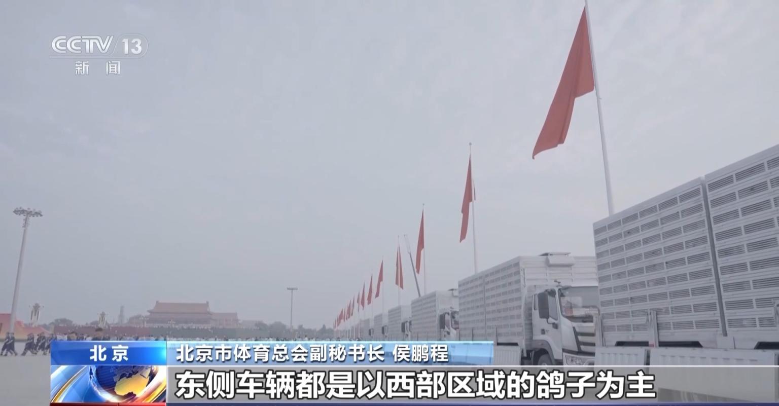 总台央视记者 赵雨彤:我身后的就是广场活动当天用的鸽笼车,一车装有两个大的鸽笼,每个笼9层之高,里面共有54个独立的小格子,每辆车能容纳近7000只鸽子。这个特制鸽笼,能让鸽子在里面待着不闷也不热。