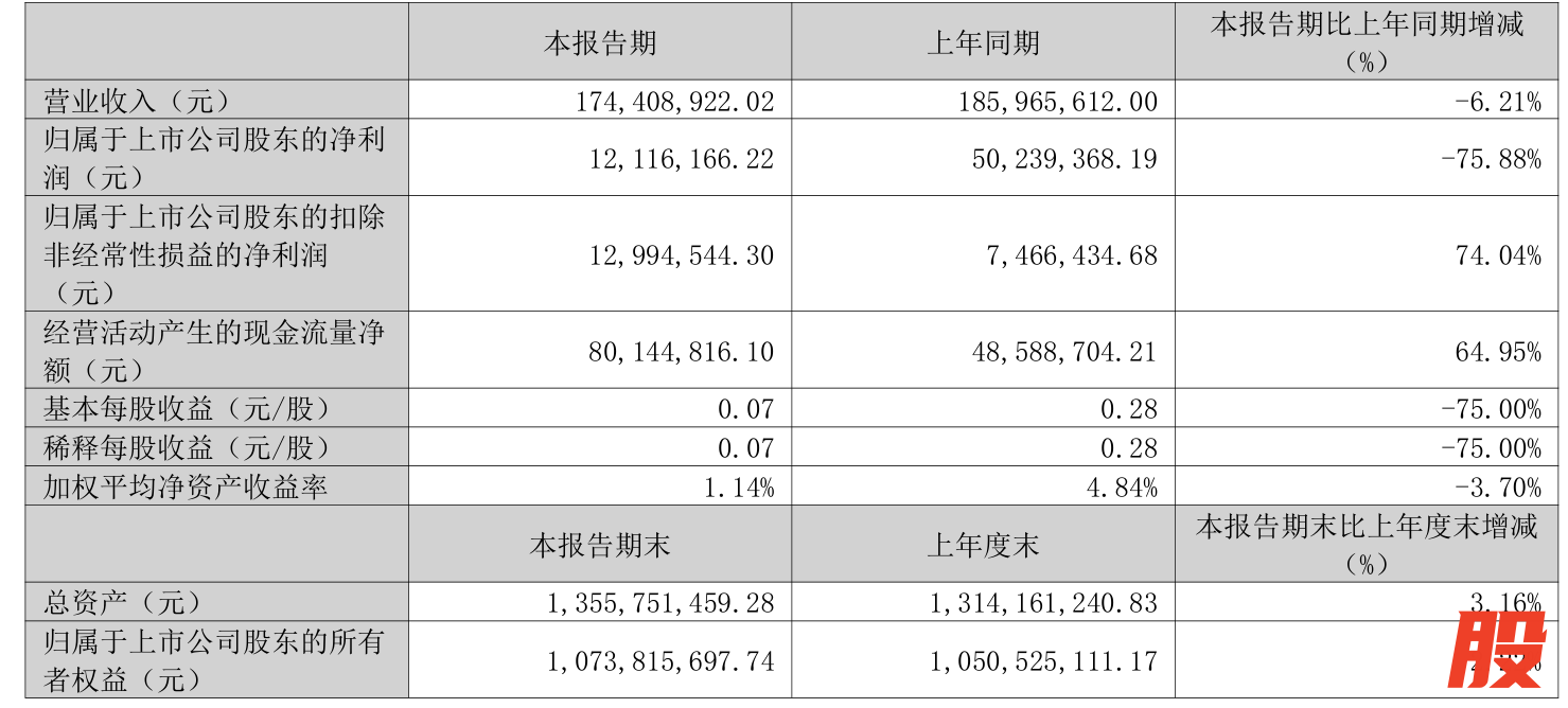 中证智能财讯神宇股份(300563)4月26日披露2025年第一季度报告。公司实现营业总收入1.74亿元,同比下降6.21%;归母净利润1211.62万元,同比下降75.88%;扣非净利润1299.45万元,同比增长74.04%;经营活动产生的现金流量净额为8014.48万元,同比增长64.95%;报告期内,神宇股份基本每股收益为0.07元,加权平均净资产收益率为1.14%。